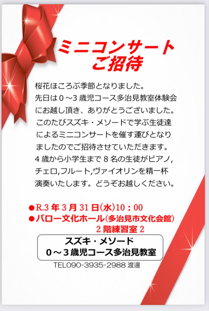 3月31日はミニコンサートを兼ねた体験会(要予約:1回無料)とさせていただきます♪